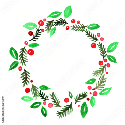 © beelaa, Fototapeta premium Pine leaves and red berry wreath in circle frame watercolor hand painting.