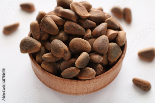 Obraz premium Pine nuts poured into a round plate. Pine nuts contain many vitamins minerals...