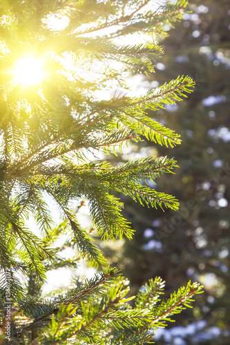 © sergeialyoshin, Obraz premium Pine or spruce Branch on the frost - Natural winter or spring background