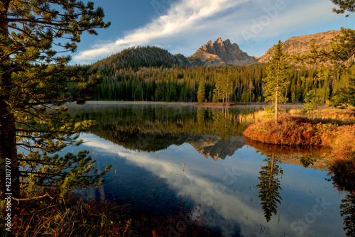 © knowlesgallery, Fototapeta premium Pine tree forest and mountain peak reflection in Idaho wilderness