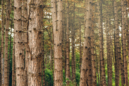 Fototapeta premium Pine tree forest in autumn october afternoon