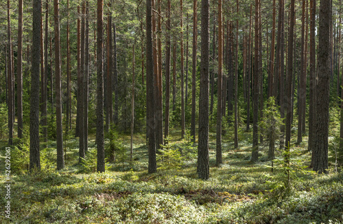 © Conny Sjostrom, Obraz premium Pine tree forest landscape and natural mossy boulders