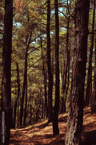 Fototapeta premium pine tree forest, many trees, natural environment, nice weather day