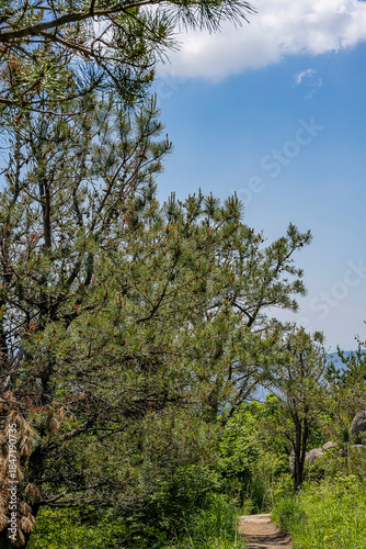 © 완수 안, Obraz premium Pine Tree Forest Path Blue Sky Summer Day