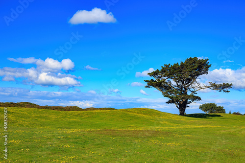 © Michael, Obraz premium Pine tree in a field of yellow flowers, with fluffy clouds in the sky above