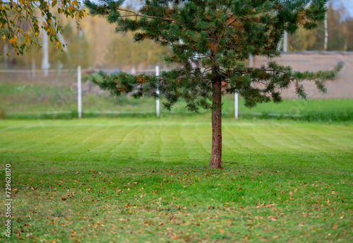 © Юлия Мальсагова, Fototapeta premium Pine tree in the garden, freshly cut lawn