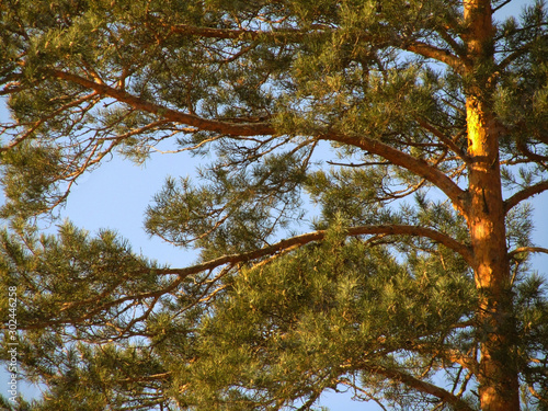 © Наталья Босяк, Obraz premium Pine tree in the sunlight. Pine tree branches against the blue sky. Close-up. Coniferous branches landscape.