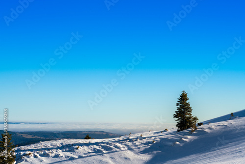 © Wheat field, Fototapeta premium Pine tree on snow-covered mountaintop in sunlight, under blue sky