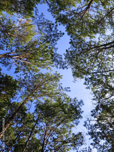 © TChareon, Obraz premium Pine tree pattern with blue sky and white cloud background, northern of Thailand