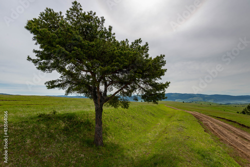 © Alpar, Obraz premium Pine tree ( Pinus Sylvestris) near dirt road on the top of the mountain in Romania.