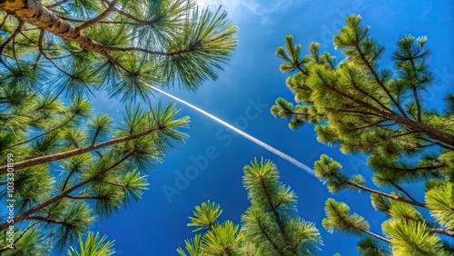 © yuwaree, Fototapeta premium Pine tree stands out in blue sky seen from below airplane trail