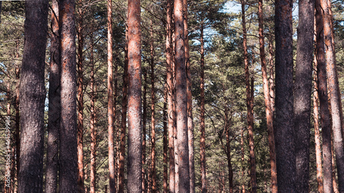 Obraz premium Pine tree trunks, closer and farther, natural background in brownish tones
