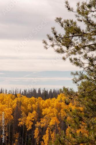 © Sarah, Fototapeta premium Pine Tree with Aspen and Pine Forest in the Background, Wyoming