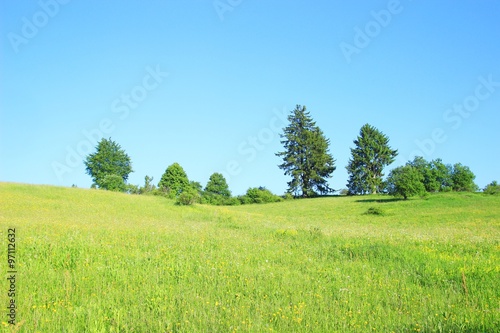 © Simun Ascic, Fototapeta premium Pine trees and green meadow in summer