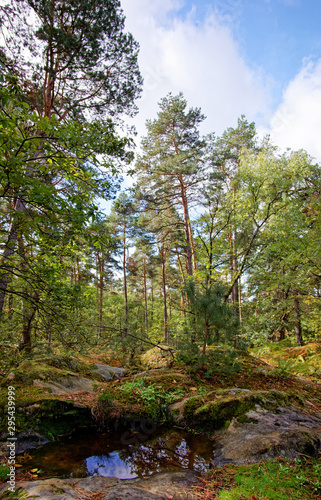 © hassan bensliman, Obraz premium Pine trees and rocks in fontainebleau forest