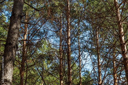 Fototapeta premium Pine trees canopy landscape in woodland.