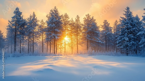 © eartist85, Fototapeta premium Pine trees covered with snow on frosty evening, beautiful winter landscape panorama