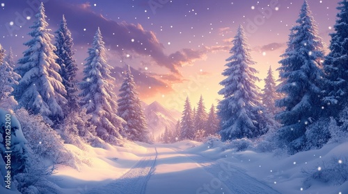 © peppastocker, Naklejka premium Pine trees covered with snow on frosty evening. Beautiful winter panorama