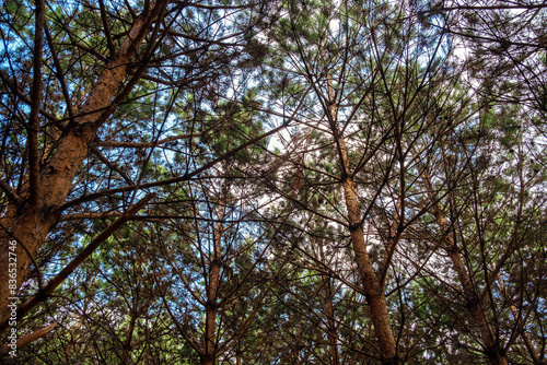 © zhennyzhenny, Obraz premium Pine trees forest under blue sky.