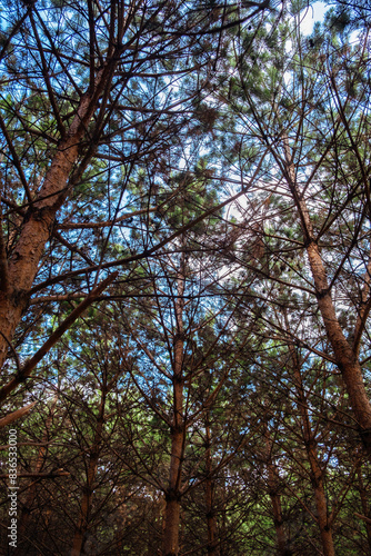 Obraz premium Pine trees forest under blue sky.