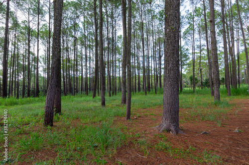 © Petch A Ratana, Fototapeta premium Pine trees forest with green grass and have soil road into the mountain.