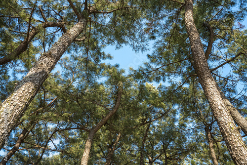 © jgdanwoo, Obraz premium Pine trees in the forest and sky