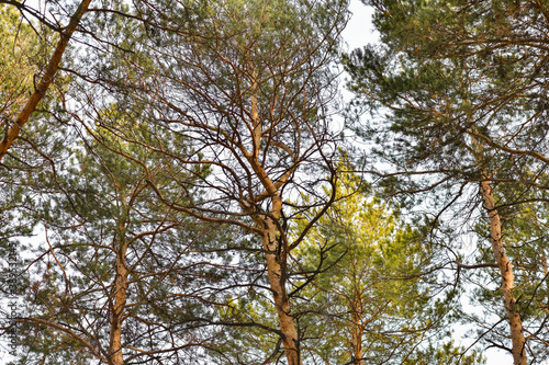 Obraz premium Pine trees in the forest. Many coniferous trees-pines on a bright day in the forest