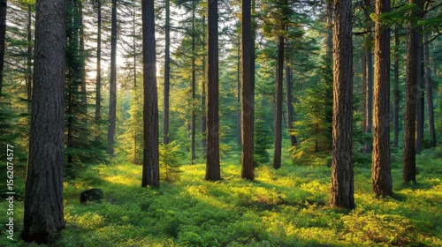 © Bilal, Obraz premium Pine trees in the forest with evening light filtering through