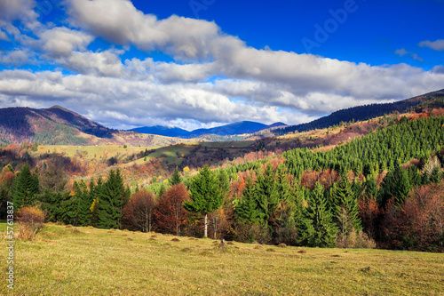© Pellinni, Naklejka premium pine trees near valley in mountains and autumn forest on hillsid
