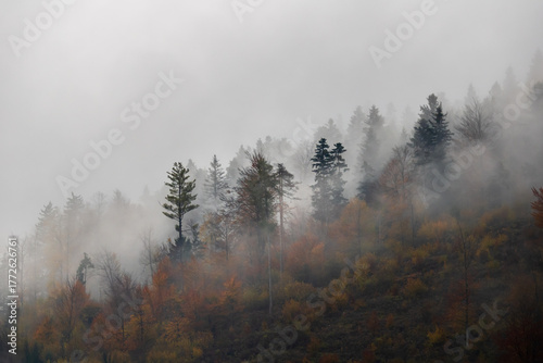 © Ijordan, Fototapeta premium pine trees on a misty mountain, misty autumn forest on hillside with colorful foliage and fog