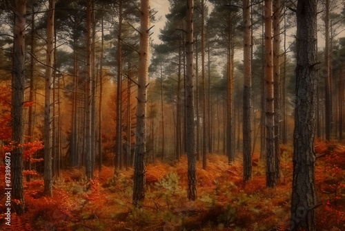© SEUNGJIN, Obraz premium Pine trees on a moody fall landscape with red and orande colors