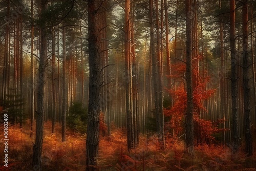 © SEUNGJIN, Obraz premium Pine trees on a moody fall landscape with red and orande colors. generative ai.