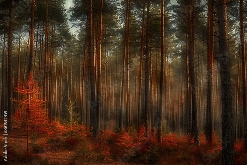 © SEUNGJIN, Obraz premium Pine trees on a moody fall landscape with red and orande colors. generative ai.