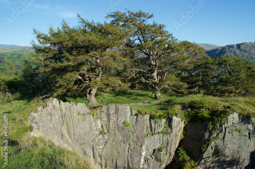 Fototapeta premium Pine trees on top of a stone cliff above an old quarry; green grass, steep crags and mountains in the background (English Lake District, UK)