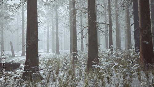 © icetray, Naklejka premium Pine trees stand tall in a snowy landscape, blanketed with soft white snow. The serene atmosphere surrounds the quiet woods, evoking a peaceful winters day.