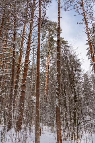 © Andrey Nikitin, Fototapeta premium Pine trees trunks in the snow as a background