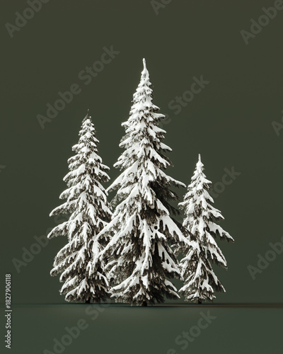Fototapeta premium Pine trees with snow on green background. Winter pine trees. 3D Rendering, 3D Illustration