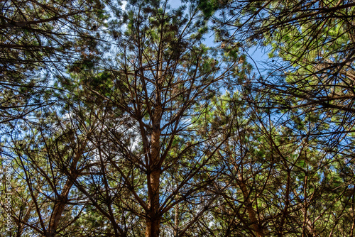 © zhennyzhenny, Fototapeta premium Pine treetops in a forest.