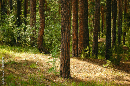 Fototapeta premium Pine trunk and sunlit undergrowth against the background of other tree trunks and green forest