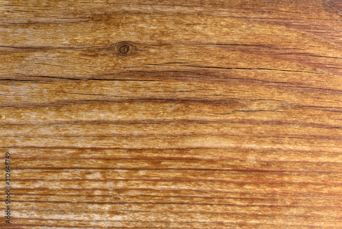 Fototapeta premium Pine wood texture. Flat old vintage pine board surface with knots and curving layers. Top view, Red-brown color tone.