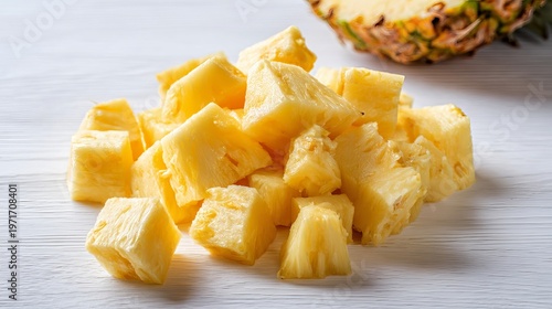 © Suleyman, Fototapeta premium Pineapple chunks lay on white surface.