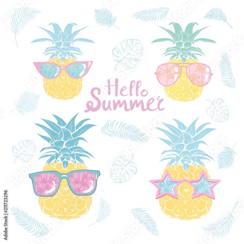 Fototapeta premium pineapple with glasses tropical, vector, illustration, design, exotic, food, fruit