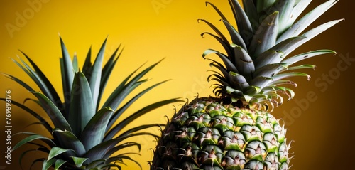 © Viktor, Fototapeta premium Pineapples on a wooden table with a yellow wall