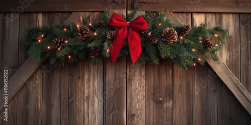 Fototapeta premium Pinecone and evergreen swag hanging over a rustic barn door, decorated with red bows and twinkling lights