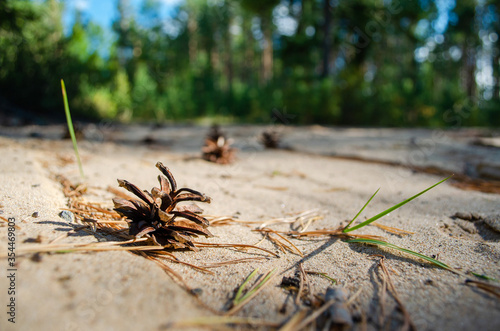Fototapeta premium Pinecone lies on the ground in the forest. Sun shines brightly on a pine...