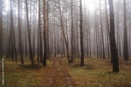 Obraz premium Pines in the forest with misty morning