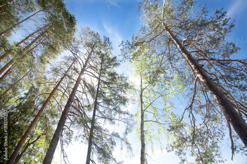 © Elena Noeva, Fototapeta premium Pines on blue sky and sun background in National Park Repovesi, Finland.