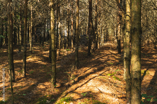 © michal812, Obraz premium Pines planted in a row, stripped of their needles due to drought