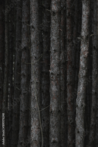 © qunamax, Obraz premium Pinewood forest tree trunks, selective focus on one tree