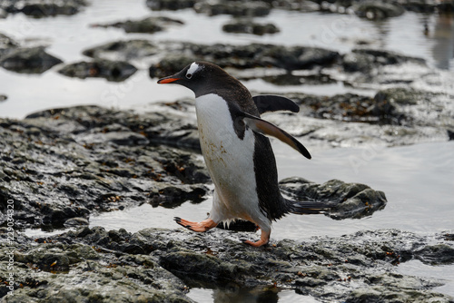 © Alexey Seafarer, Fototapeta premium Pingwin białobrewy wybiera się na plażę na Antarktydzie
